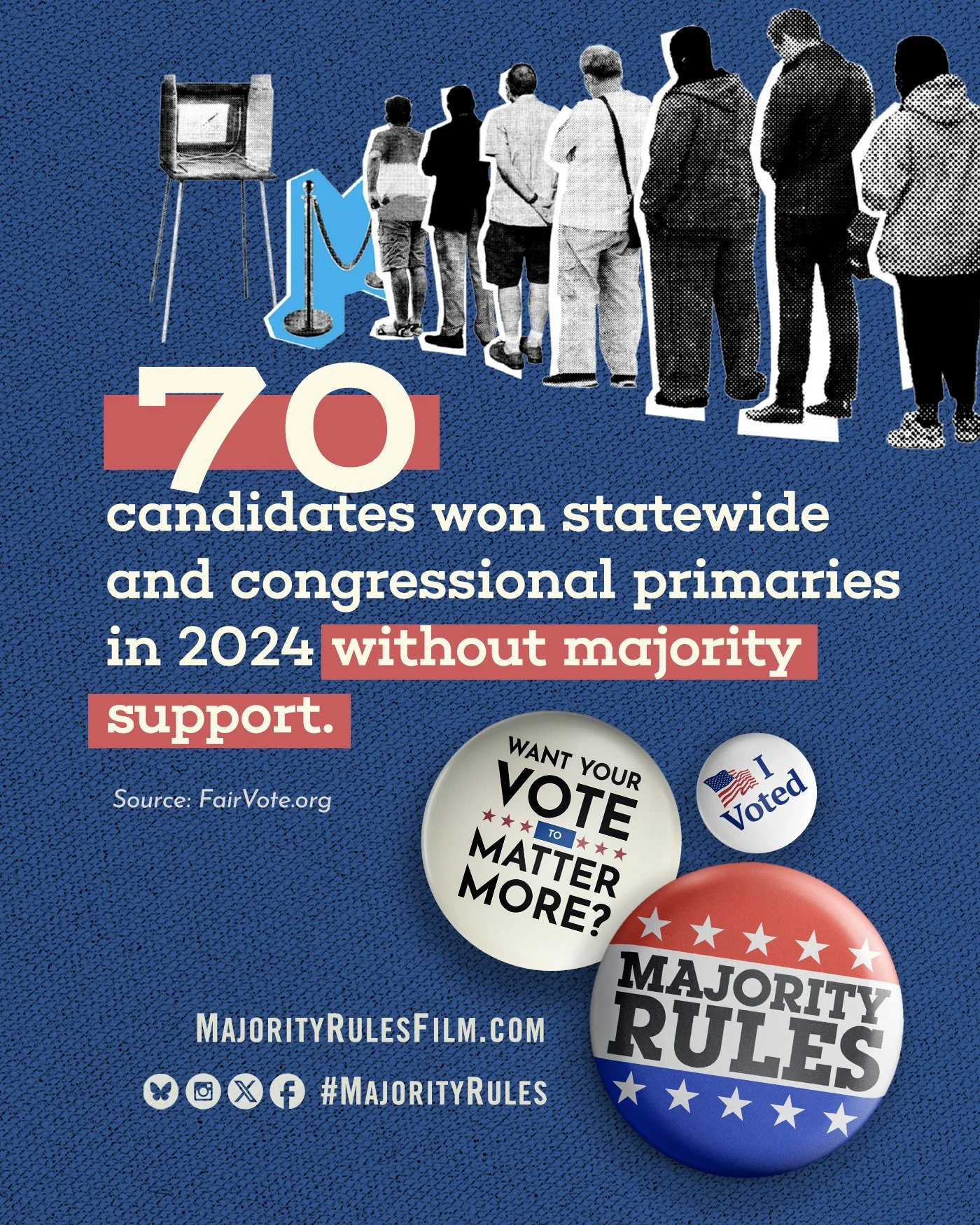 All-candidate open primaries with instant runoff general elections might just be the antidote to America’s electoral woes. With bipartisan support, they may already improving elections in communities across America. Learn more in the documentary MAJORITY RULES, from acclaimed filmmaker AJ Schnack. ➡️ majorityrulesfilm.com